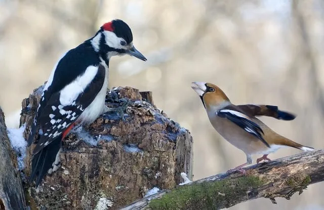 Yes, the animal world can be harsh and cruel as well as ours is and it is much about the survival of the fittest and the most insolent. So here’s a story where a woodpecker and a grosbeak came across... Only one could stay with delicious food and the other one should kiss this food goodbye…